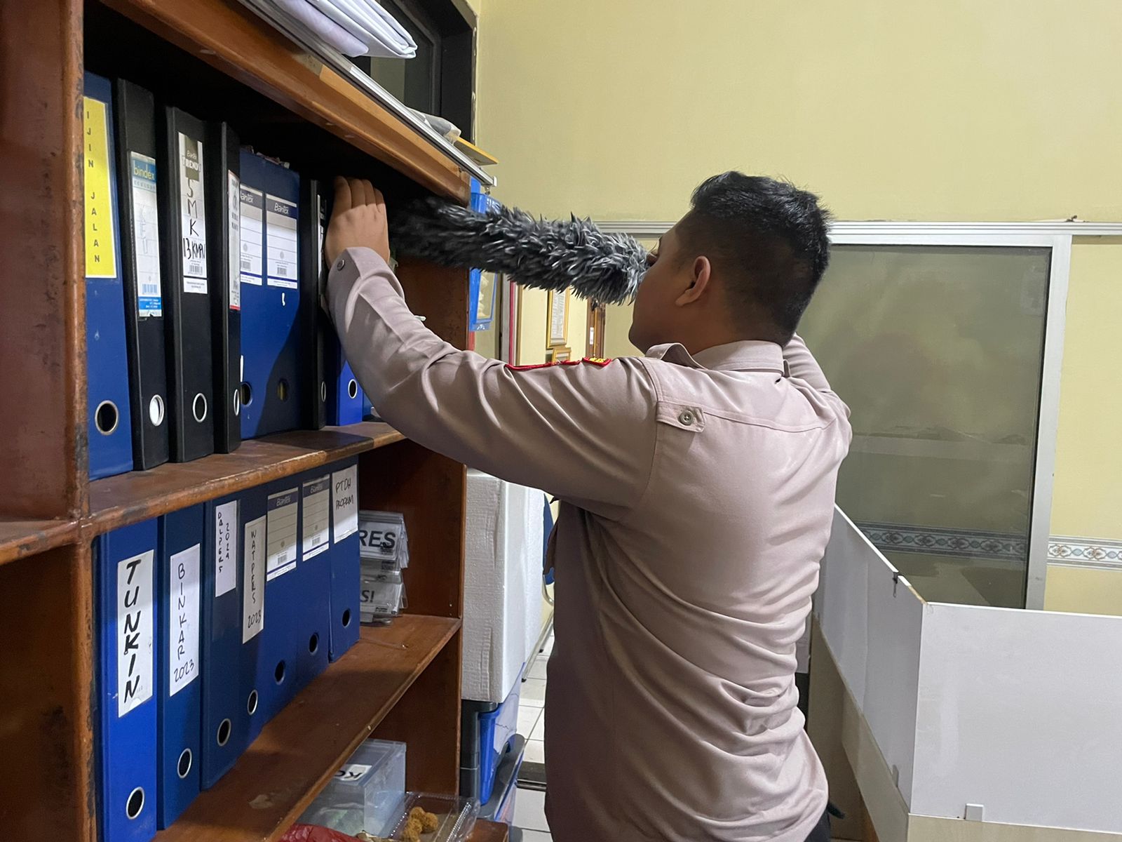 anggota SDM Polres Cilegon, daalam Pelaksanaan menjaga kebersihan ruangan kerja setiap saat.