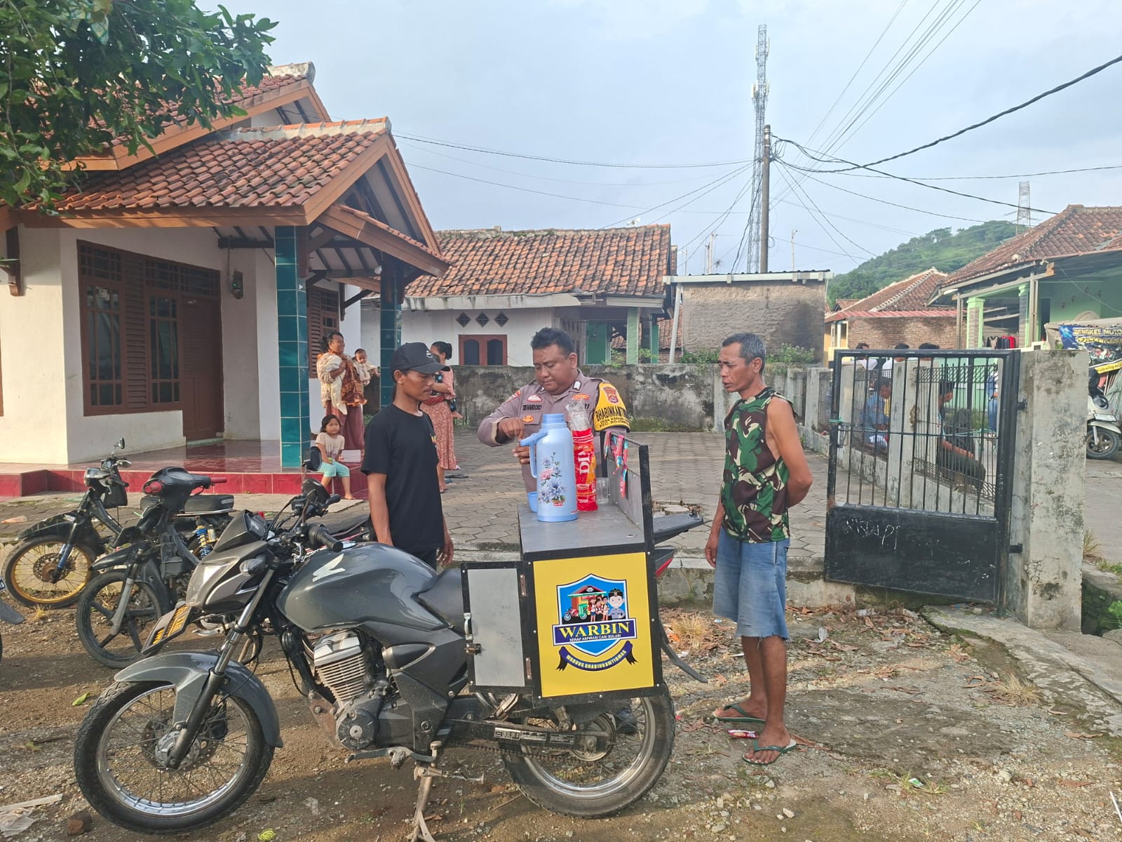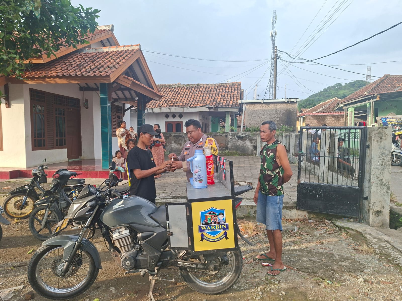 Program Warbinling Untuk Setiap Aspirasi Masyarakat, Personel Bhabinkamtibmas Ds Karangkepuh & Intel Polsek Bojonegara Kini Jualan Kopi Keliling & Sosialisasi Call Center 110 Warga