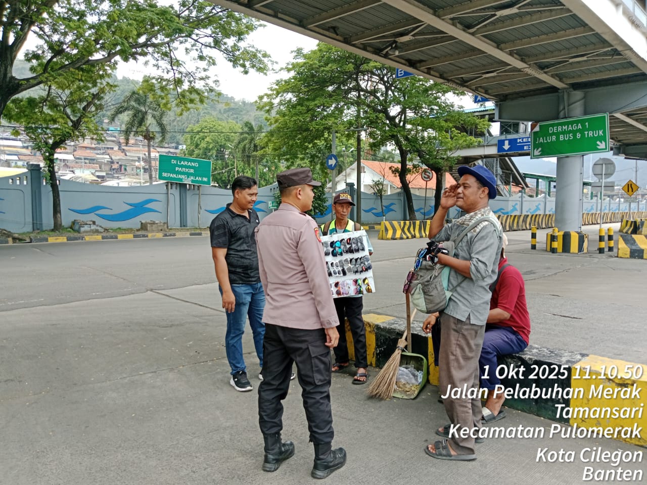 Cilegon - Personel Polsek Kskp Merak Polres Cilegon Polda Banten melaksanakan sambang dan patroli kawasan pelabuhan merak dalam rangka menjaga Harkamtibmas di Kawasan Pelabuhan Merak, Rabu (01/10/2025).