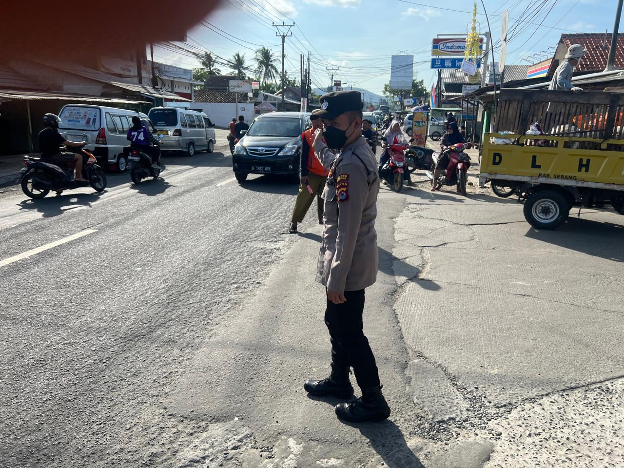 anggota polres cilegon lasanakan pengaturan arus lalin pagi hari guna mengurai kemacetan