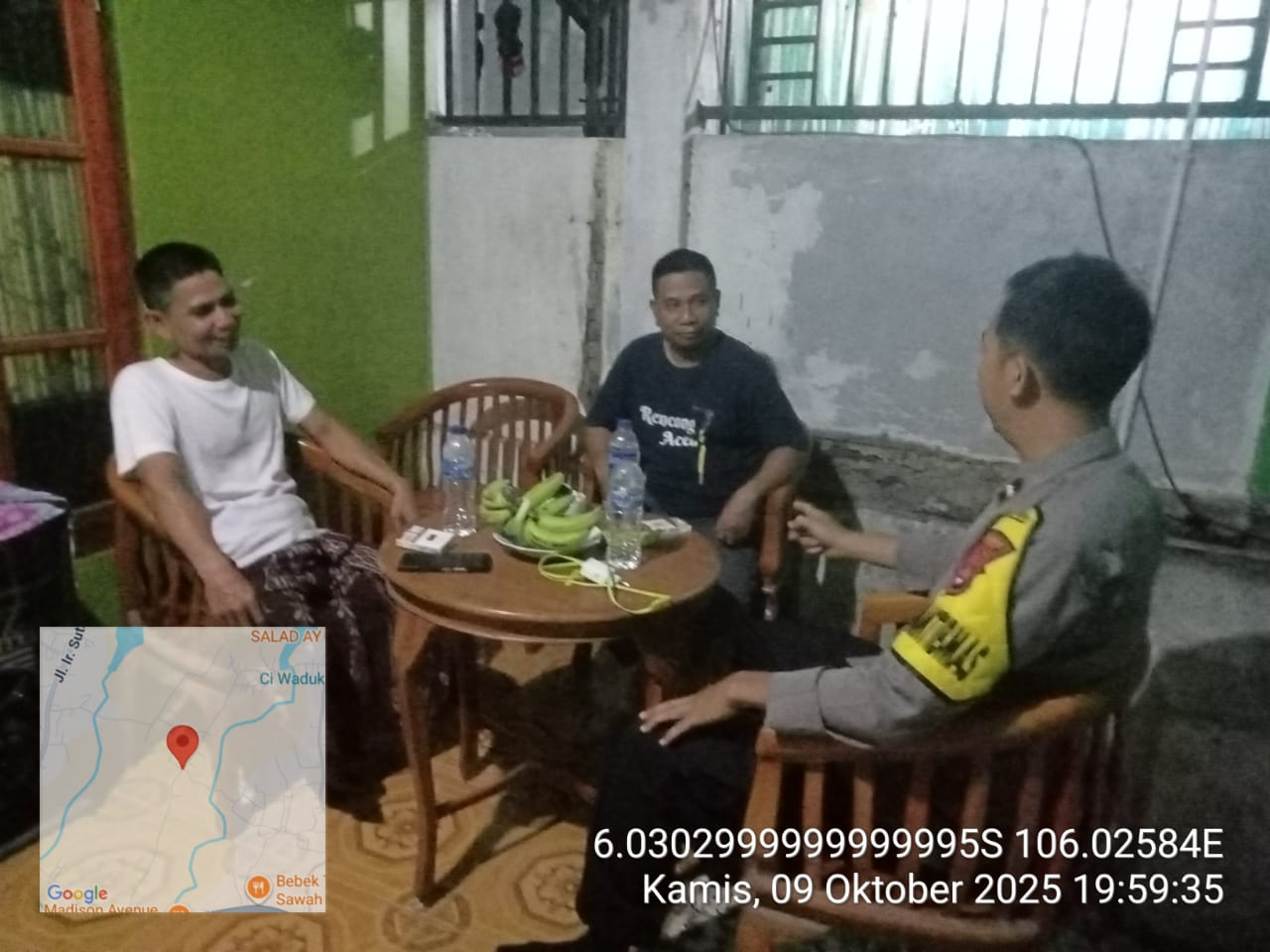 Cilegon - Upaya mengantisipasi aksi kejahatan pada daerah binaan dan memberikan rasa aman dan nyaman kepada warga binaan, Bhabinkamtibmas Polsek Ciwandan Polres Cilegon Polda Banten sambangi warga pada malam hari, Jum’at (10/10/2025).