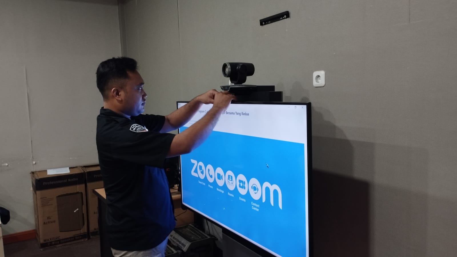 Anggota Tik Polres Cilegon Menyiapkan Sarana dan Prasarana Untuk Kegiatan Zoom meeting Dalam pelaksanaan kegiatan zoom meeting tersebut anggota TIK Polres Cilegon yang bertanggung jawab untuk menyiapkan peralatan zoom. Selain itu agar di tidak ada gangguan jaringan sebelum pelaksanaan anggota TIK melakukan pemeriksaan terhadap sarana dan prasarana tersebut . Satu jam sebelum kegiatan zoom meeting itu dimulai. Kapolres Cilegon AKBP. DR. MARTUA RAJA TARIPAR LAUT SILITONGA. melalui Kasi TIK IPTU Lukman menyampaikan bahwa “untuk menunjang kelancaran penyampaian informasi anggota TIk Polres Cilegon selalu memeriksa sarana dan prasarana tersebut, sebelum maupun pada saat pelaksanaan akan selalu di monitor”