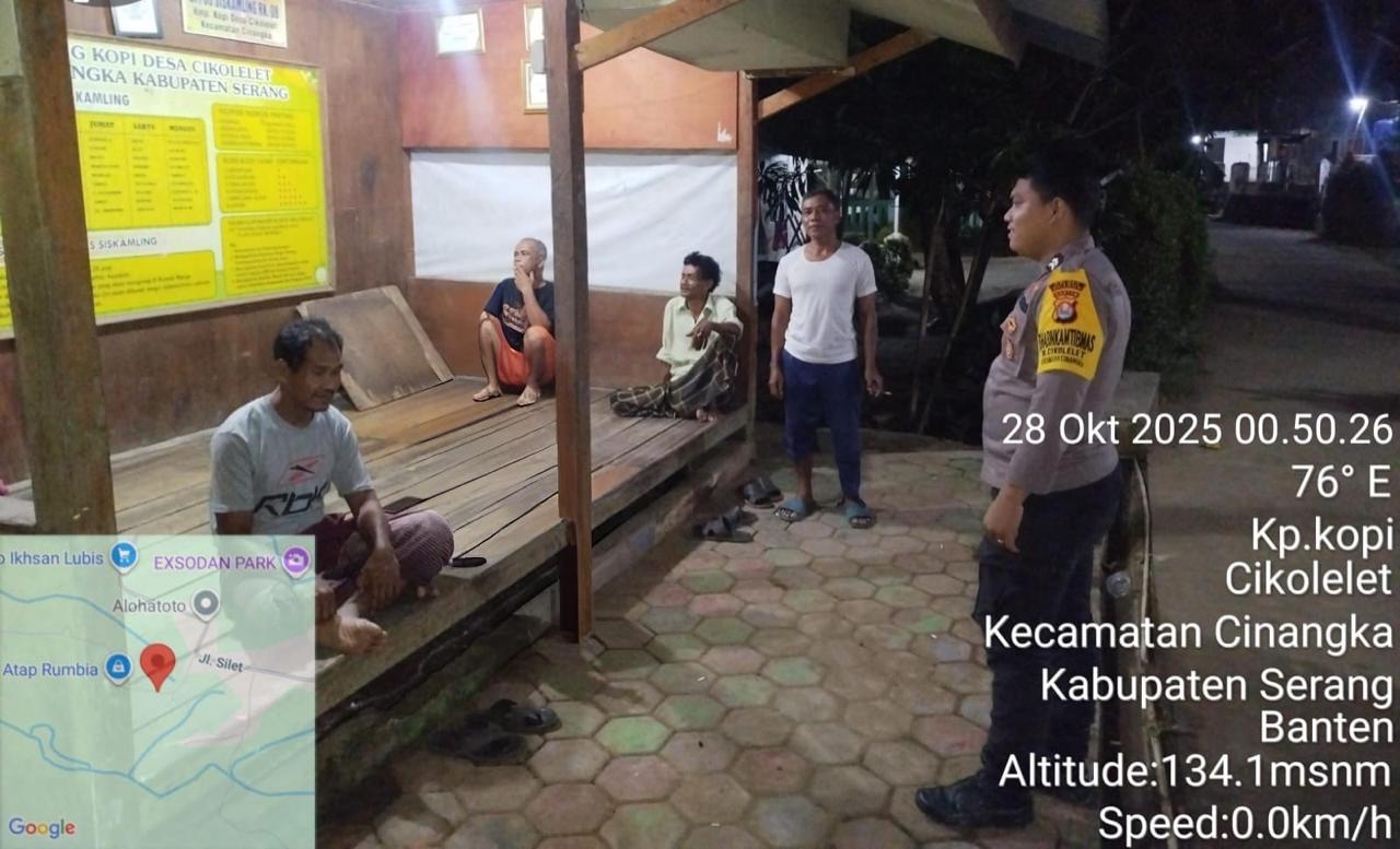 *Polres Cilegon* || Personel Bhabinkamtibmas Polsek Cinangka melaksanakan Program Komandan Wish Kapolda Banten RONDA SATKAMLING menyampaikan komunikasi dengan Petugas Siskamling agar berperan aktif dalam menciptakan Harkamtibmas yang aman dan Kondusif, Selasa (28/10/2025).