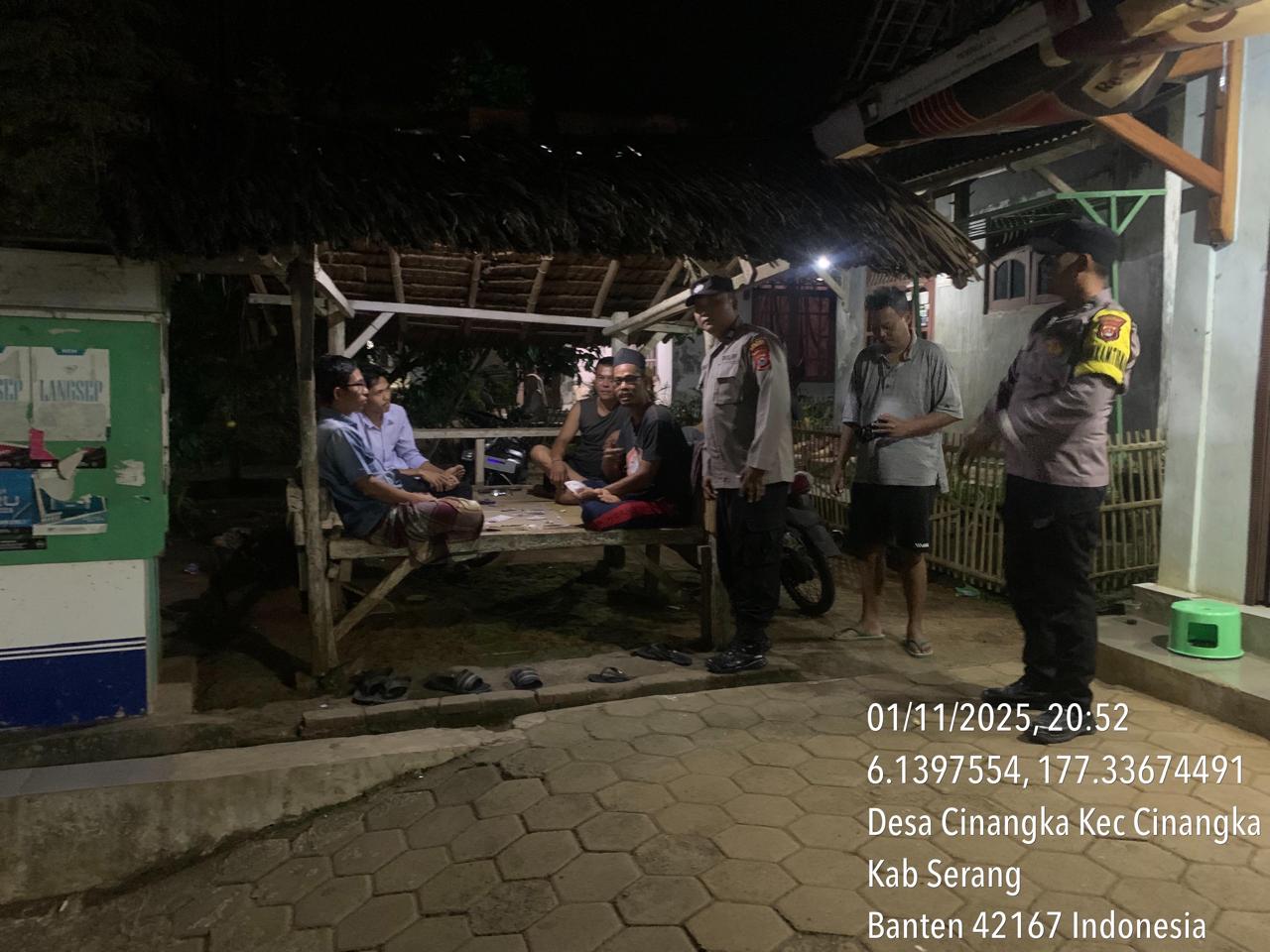 *Polres Cilegon* || Personel Bhabinkamtibmas Polsek Cinangka melaksanakan Program Komandan Wish Kapolda Banten RONDA SATKAMLING menyampaikan komunikasi dengan Petugas Siskamling agar berperan aktif dalam menciptakan Harkamtibmas yang aman dan Kondusif, Minggu (02/11/2025).