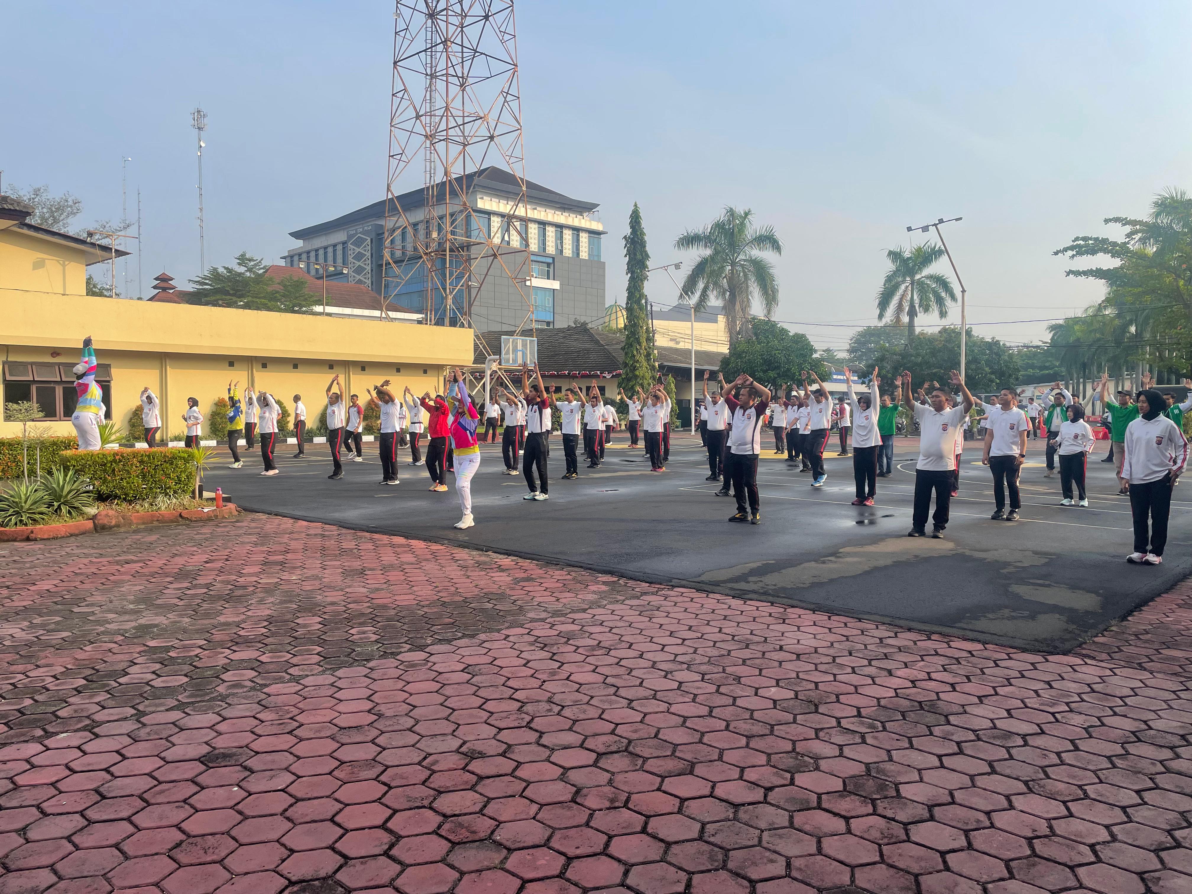 Kegiatan senam setiap hari Jumat di Polres Cilegon dipimpin oleh instruktur senam yang berpengalaman.