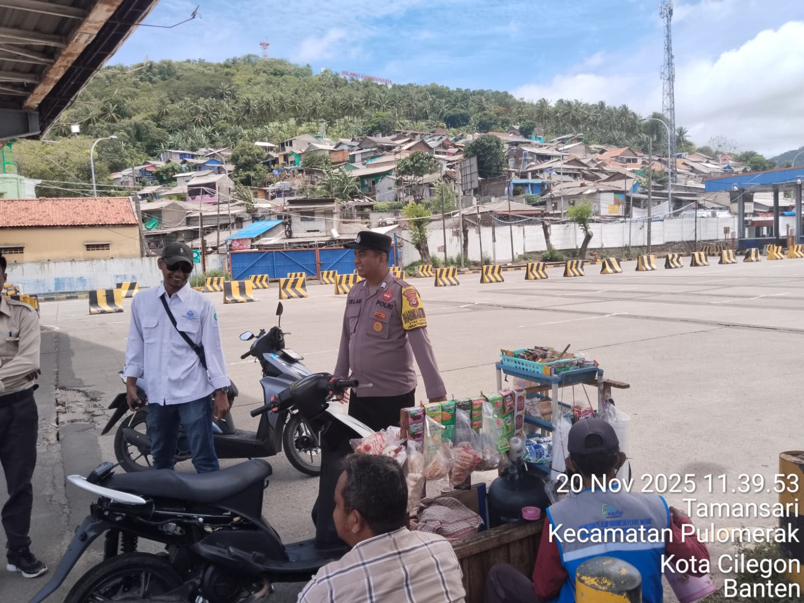 Cilegon - Personel Polsek Kskp Merak Polres Cilegon Polda Banten melaksanakan sambang dan patroli kawasan pelabuhan merak dalam rangka menjaga Harkamtibmas di Kawasan Pelabuhan Merak, Kamis (20/11/2025).