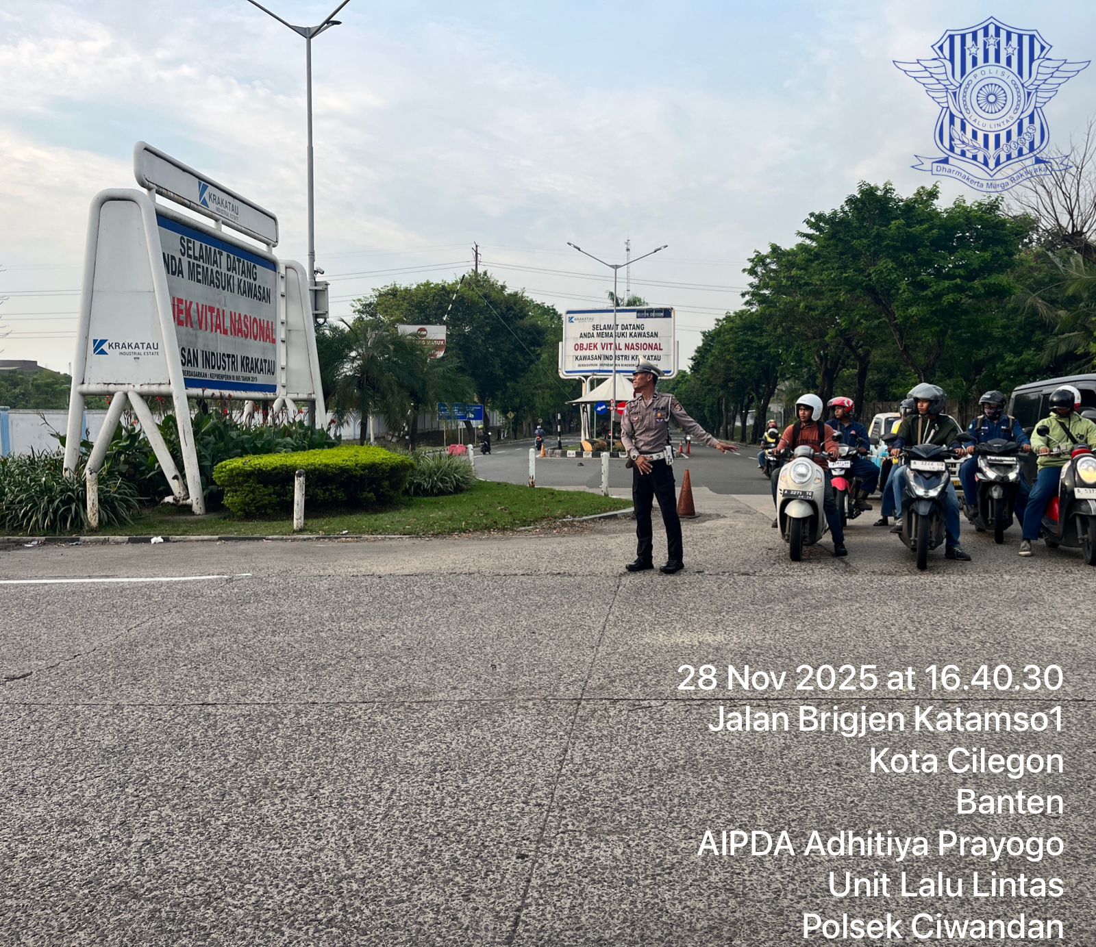 Cilegon - Guna Kelancaran Lalu-lintas Personil Unit Lantas Polsek Ciwandan Polres Cilegon Polda Banten melaksanakan pengaturan lalu-lintas di Simpang Beringin Ciwandan Pertigaan Kawasan Industri KSP/ KIEC I  kelurahan Warnasari Kecamatan Citangkil Kota Cilegon, Minggu (30/11/2025).