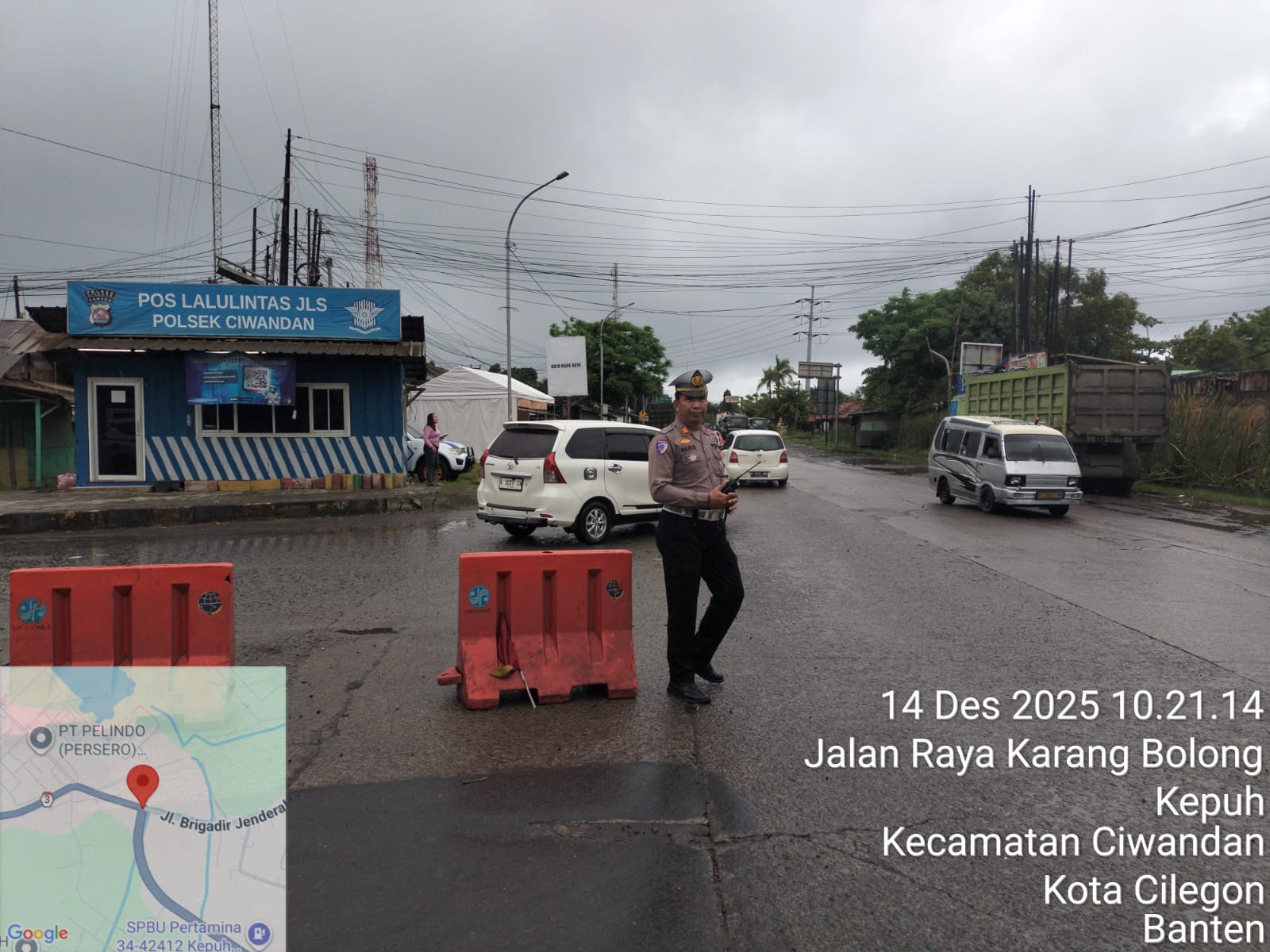 *Cilegon* - Personil Unit Lantas Polsek Ciwandan Polres Cilegon Polda Banten melaksanakan kegiatan monitoring jalur wisata di depan Pos Lantas JLS Ciwandan, Minggu (14/12/2025).