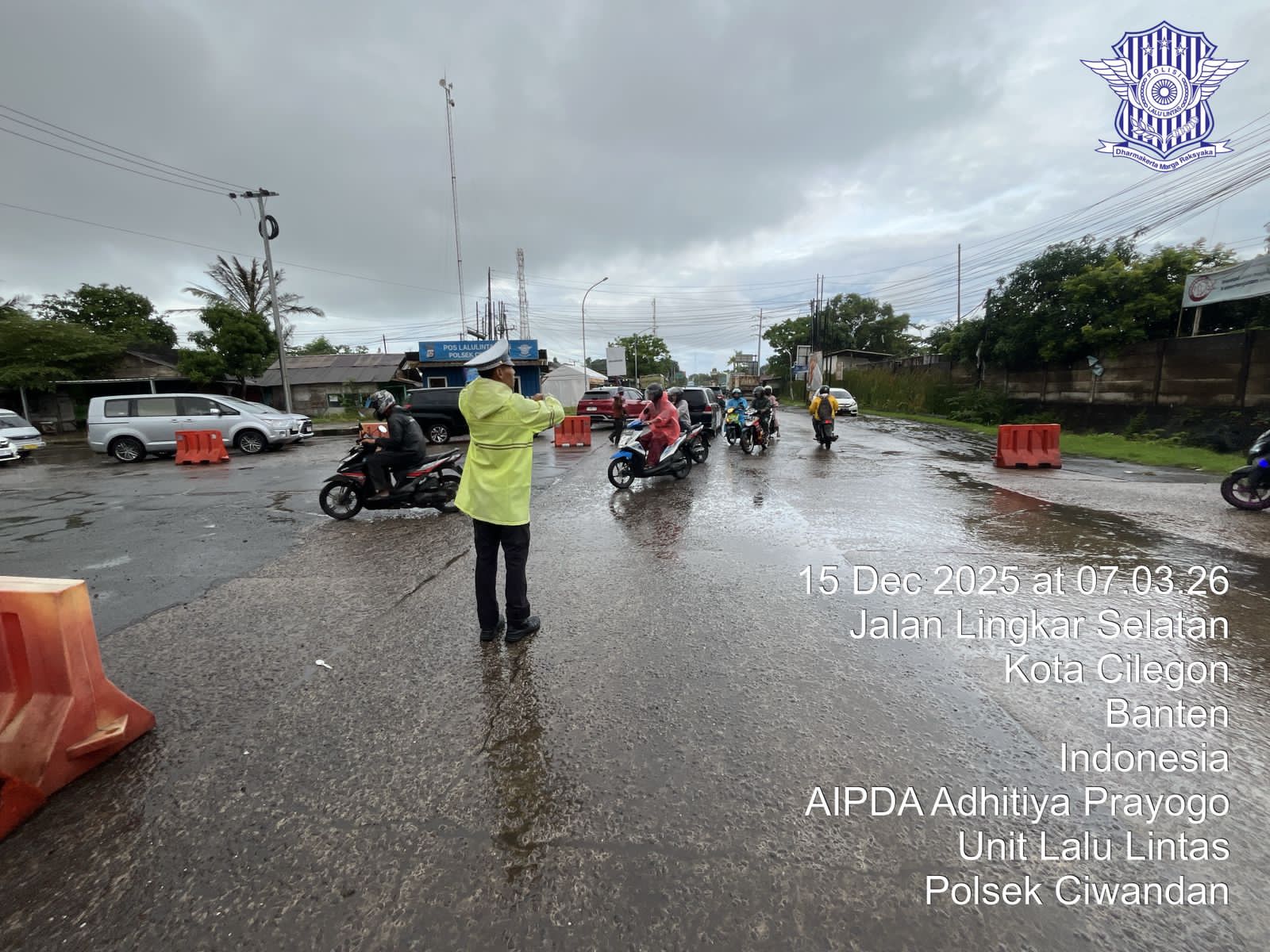 Cilegon - Unit Lalu-lintas Polsek Ciwandan Polres Cilegon Polda Banten Turunkan Personilnya melaksanakan pengaturan lalu lintas di Simpang JLS Ciwandan Pertigaan PT. Cemindo kelurahan Kepuh Kecamatan Ciwandan Kota Cilegon, Senin (15/12/2025).