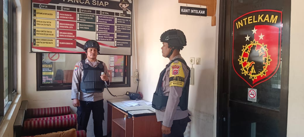 “Anggota piket jaga Polsek Mancak melaksanakan Sispam Mako dilengkapi dengan bodyvest, helm kevlar, dan senjata api salah satu upaya peningkatan kemanan mako guna mencegah hal-hal yang tidak dapat di duga selama server berlangsung.”