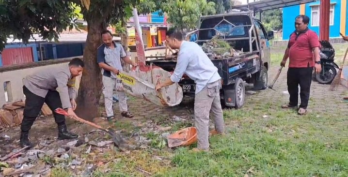 Dalam kegiatan tersebut, Bripka Agustoni bersama warga bergotong royong membersihkan sampah dan material yang berserakan di sekitar lingkungan serta mengangkutnya menggunakan kendaraan untuk membuang ke tempat yang telah disediakan.