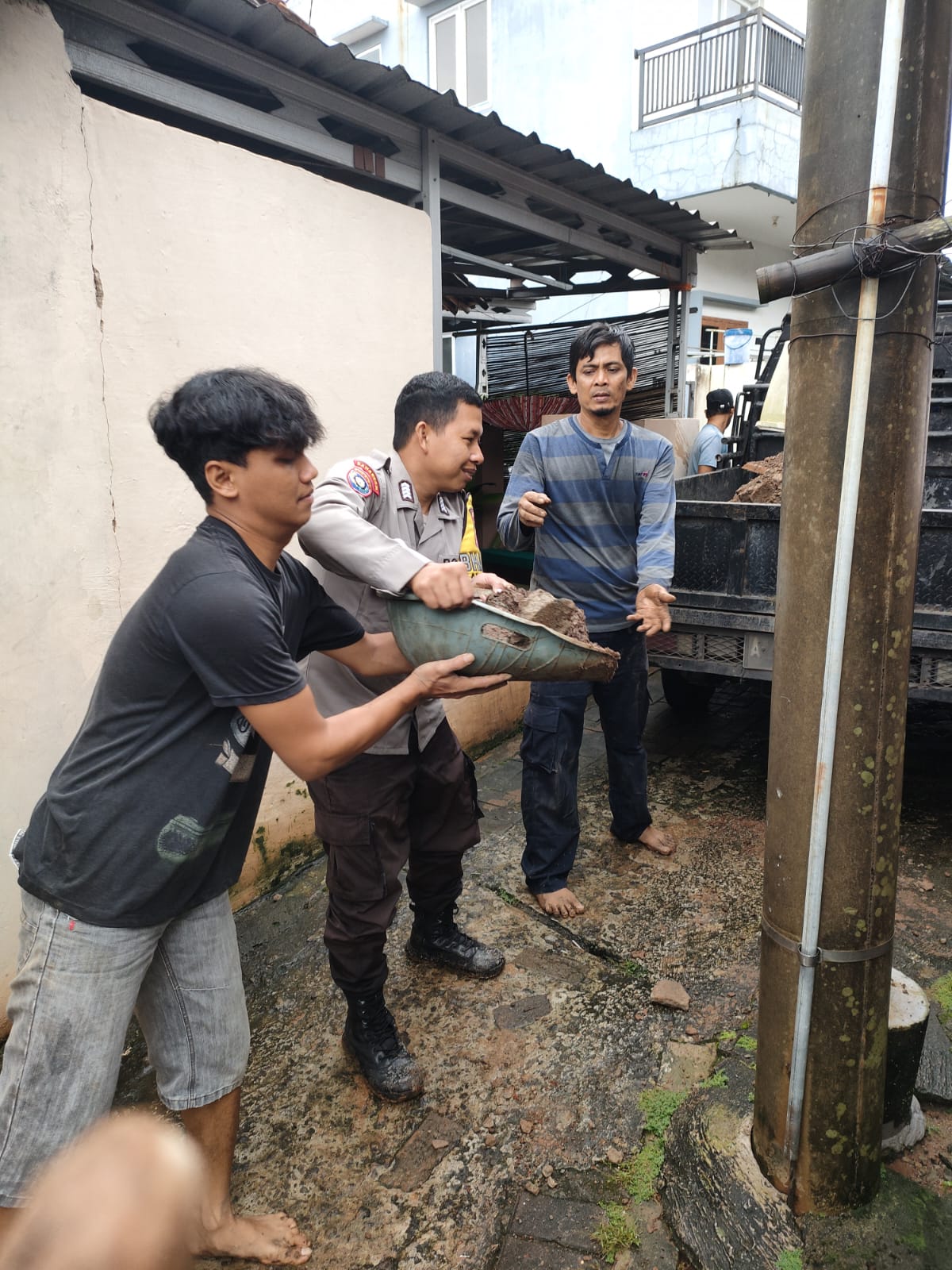 Bhabinkamtibmas Polsek Purwakarta Bersama Warga Gotong Royong bersihkan Longsoran di Pemukiman Warga